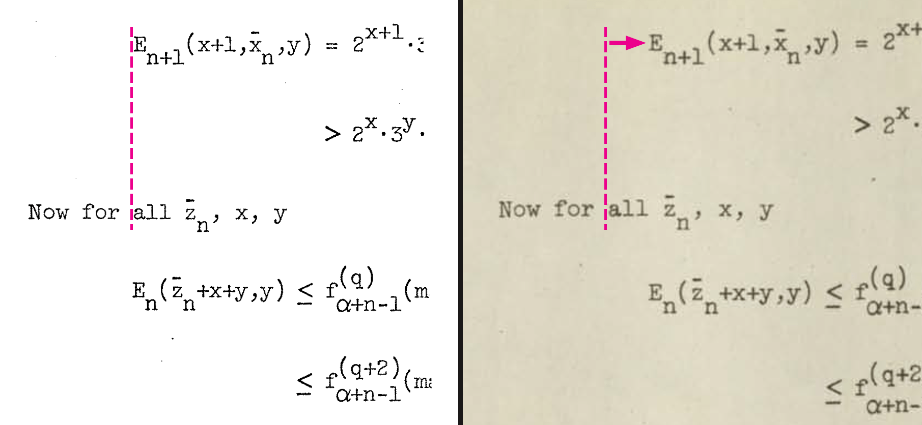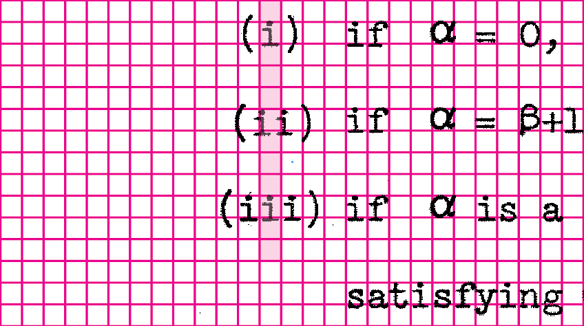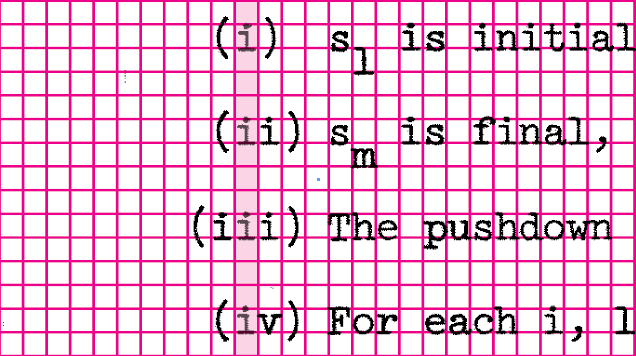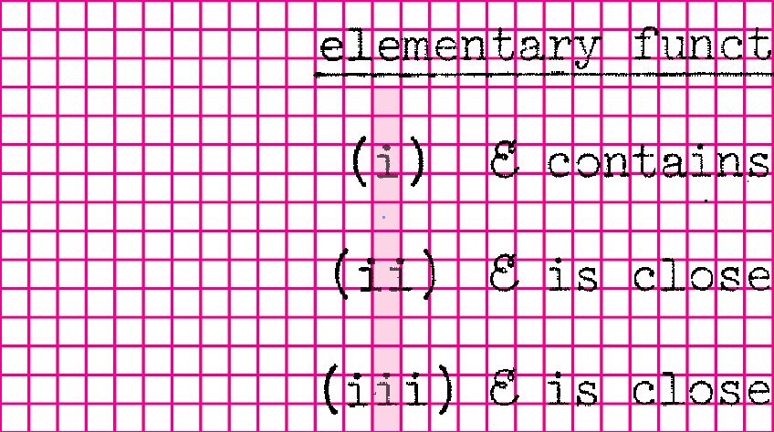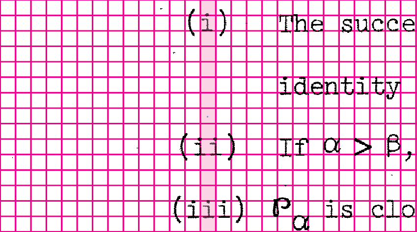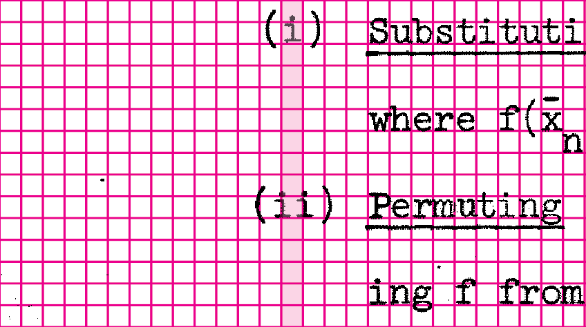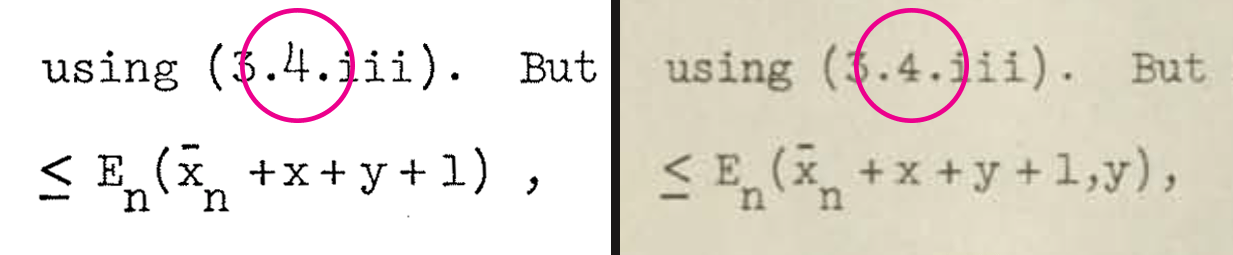 There’s another feature that distinguishes this thesis other 1960s math dissertations.  Dennis positioned his sub-and-superscript characters exactly above or below their main reference line, not at fractional distance as was common to other math papers.  As we examine the dissertation page by page, it appears that all the characters are being controlled together.  The positioning aligns to a grid system, each character impression placed exactly where it should be, no indication of manual adjustment even with multi-layered sub-and-superscripts.
