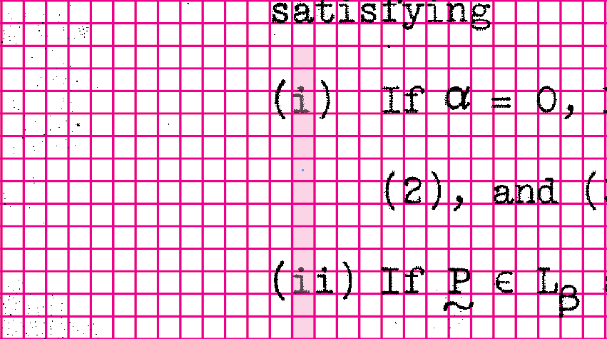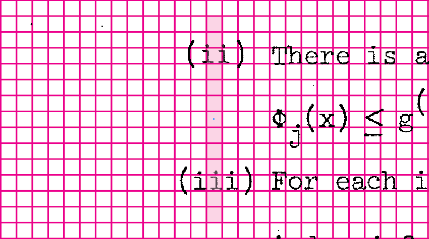 Page 52 is filled with characters that stray off the grid.  However, closer inspection reveals that most of these off-grid expressions are very similar to each other.  Each individual math expression is indeed off the grid, but they are all off the grid in the same way.  This is not random!
