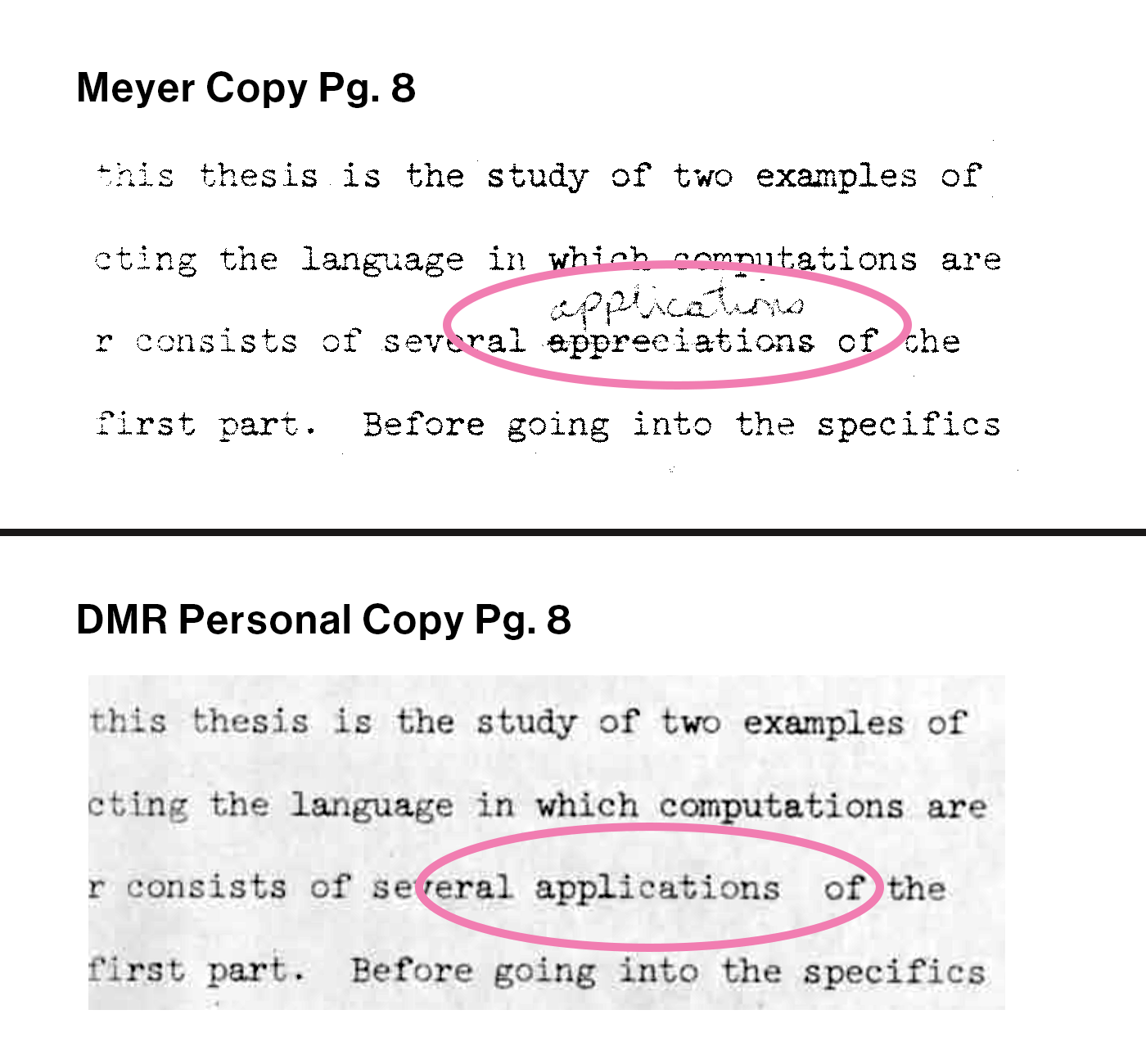 The “Meyer” version of the dmr thesis was completed in January 1968 and sent to two colleagues for review.  Dennis marked small edits in pencil onto 30 pages across the document.