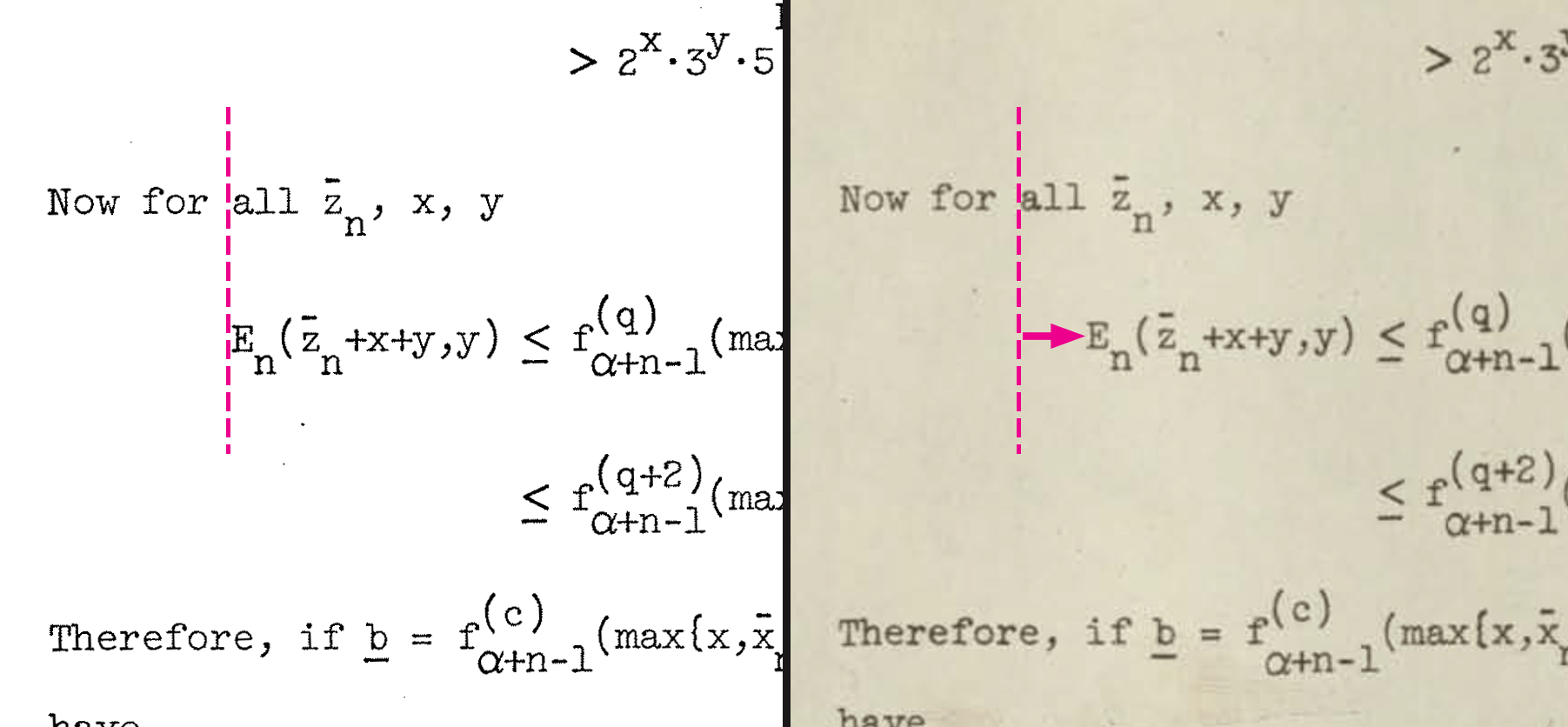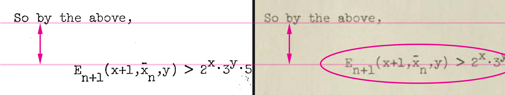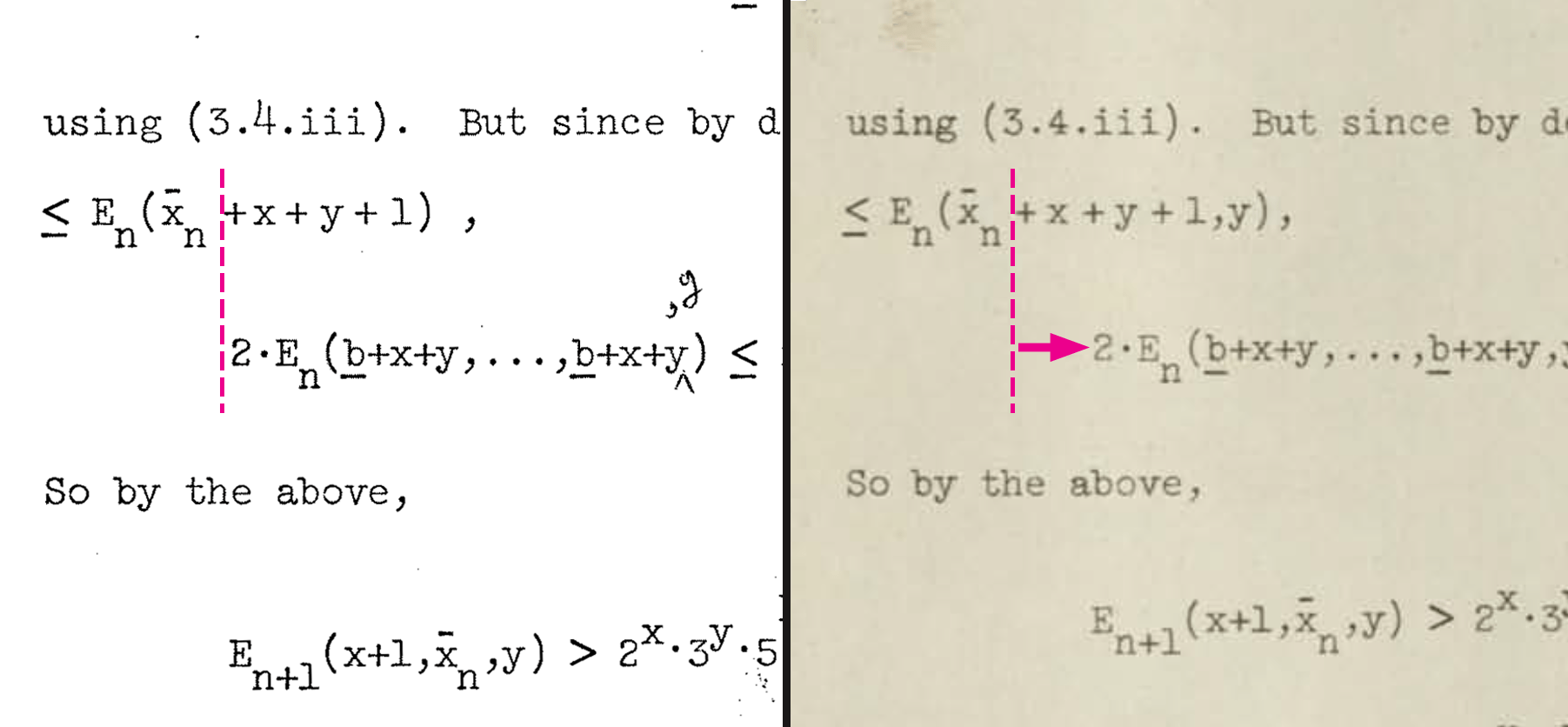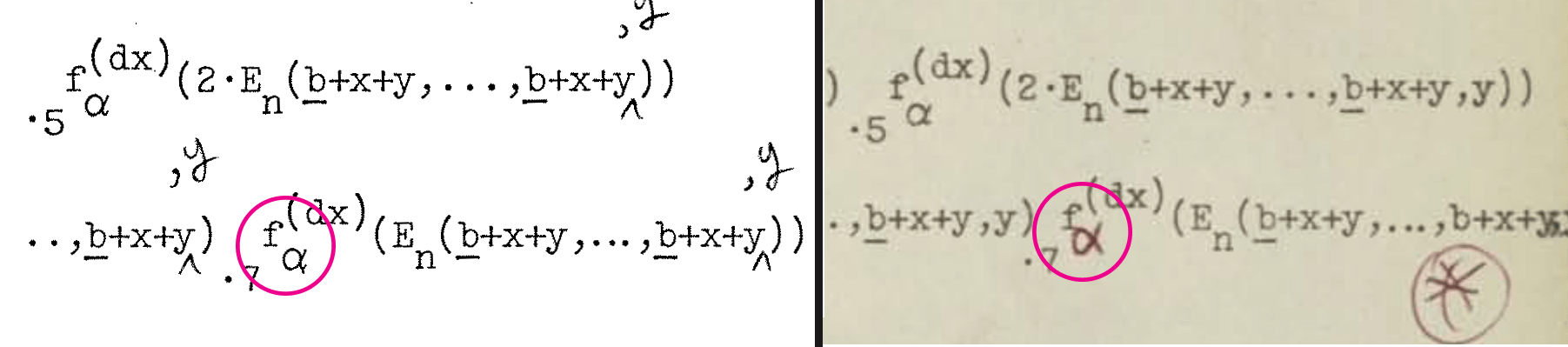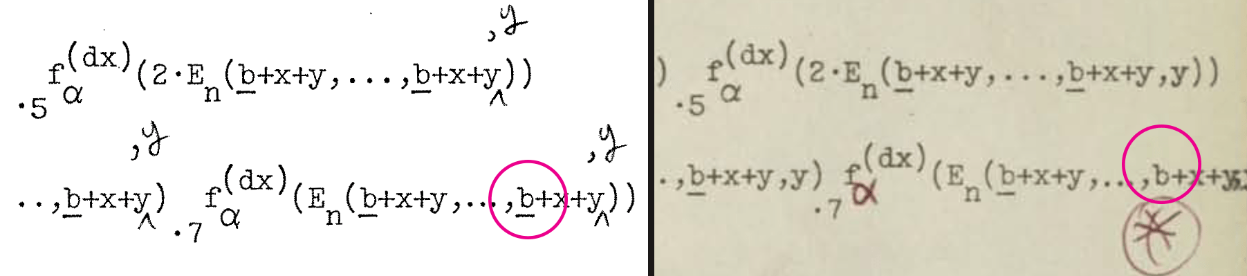 Here the “b” has an underline in the Meyer version which is missing in the dmr version (Dennis notes it with a red pen star).